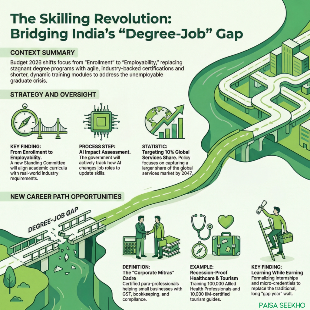Budget 2026 tries to fix this mismatch. The “Corporate Mitra” scheme is a recognition that you don’t need a PhD to be useful. You just need a specific skill that the market values.